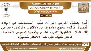فضيلة الشيخ وفقكم الله. يقول السائل اقوم بدعوة اقاربي الى ان تكون اضحياتهم في البلاد الفقيرة. فاقوم بجمع الاموال من الاقارب وتوكيل احد في تلك البلاد الفقيرة لشراء اضاحي وذبحها بمسيس الحاجة. فانكر عليه. فهل هذا الانكار صحيح؟ نعم الانكار صحيح لان هذا خلاف السنة. السنة ان تذبح له - 00:00:00ضَ