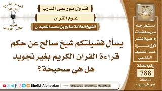 يسأل فضيلتكم شيخ صالح عن حكم قراءة القرآن الكريم بغير تجويد. هل هي صحيحة هي صحيحة لكن كل ما كان الانسان اكثر اتقان للقراءة واحسن اداء لها واحلى ترنما وتغنيا بها بدون تخلف - 00:00:00ضَ